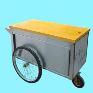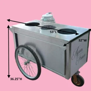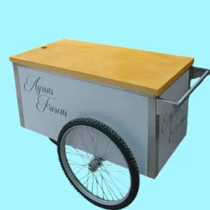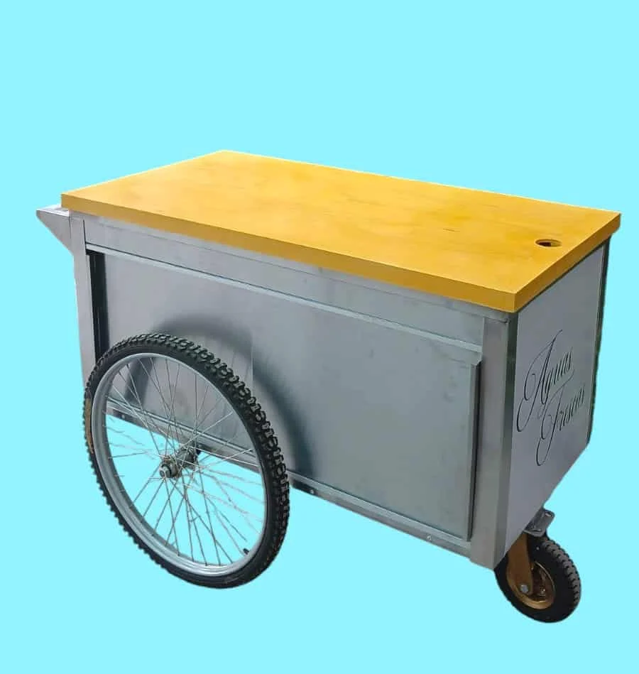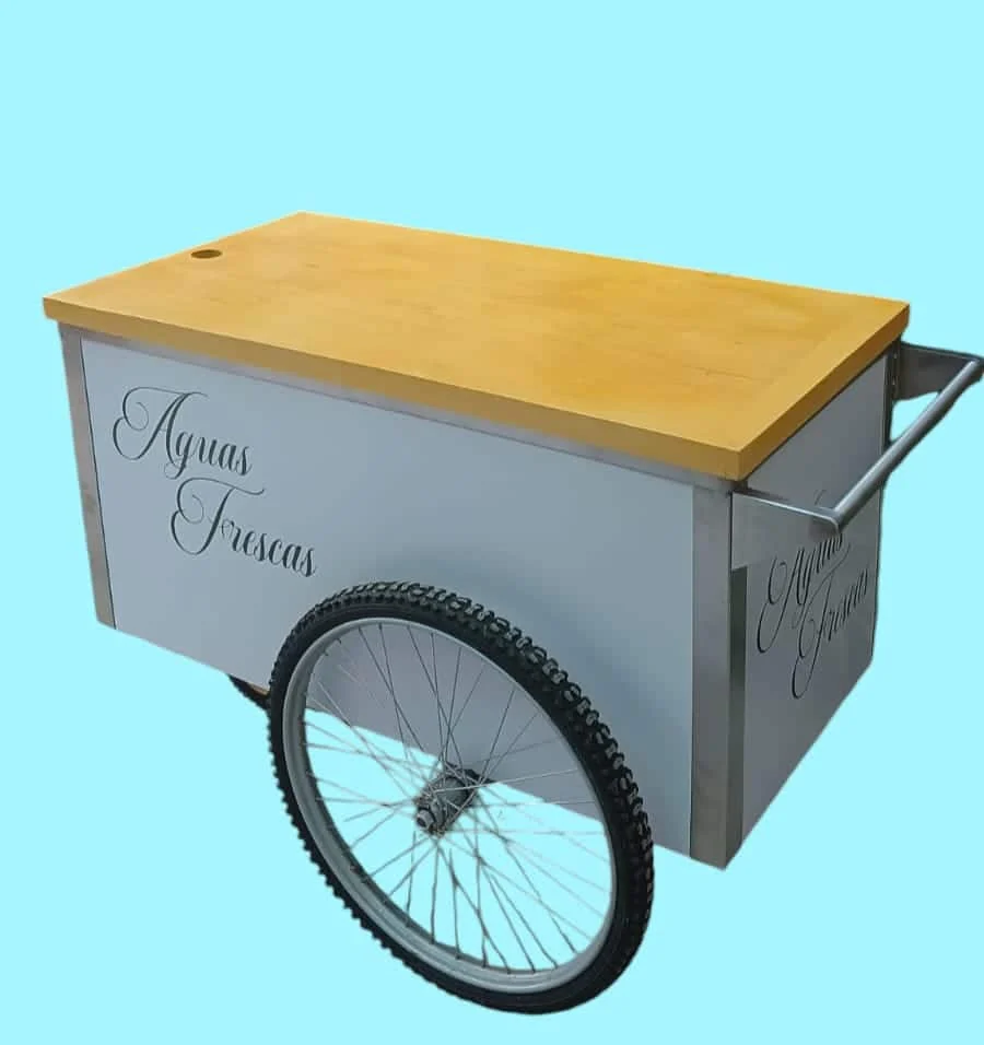 Launch your business with this elegant Vitrolero Cart / Bar Cart featuring stainless steel bodywork and and bicycle tires that give it an elegant style. Perfect for indoor and outdoor events, this cart’s lightweight and maneuverable design make it easy to use in any location. The removable top wood lays flat so it can be used as a mobile bar, snack cart, coffee cart etc Made of stainless steel insures durability, you will have cart for a long time. It comes wrapped on the 3 sides in white with Agua Fresca print in black.