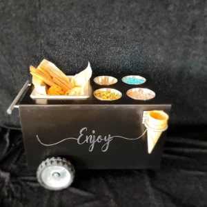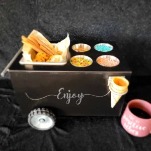 The Snack/Ice Cream Table Top Cart is designed to be personalized to fit your business or event. Add custom decals, logos, or decorations to make it stand out. The white cart comes with a pre-applied “Enjoy” vinyl sticker, while the black cart is blank, ready for your own unique touch.