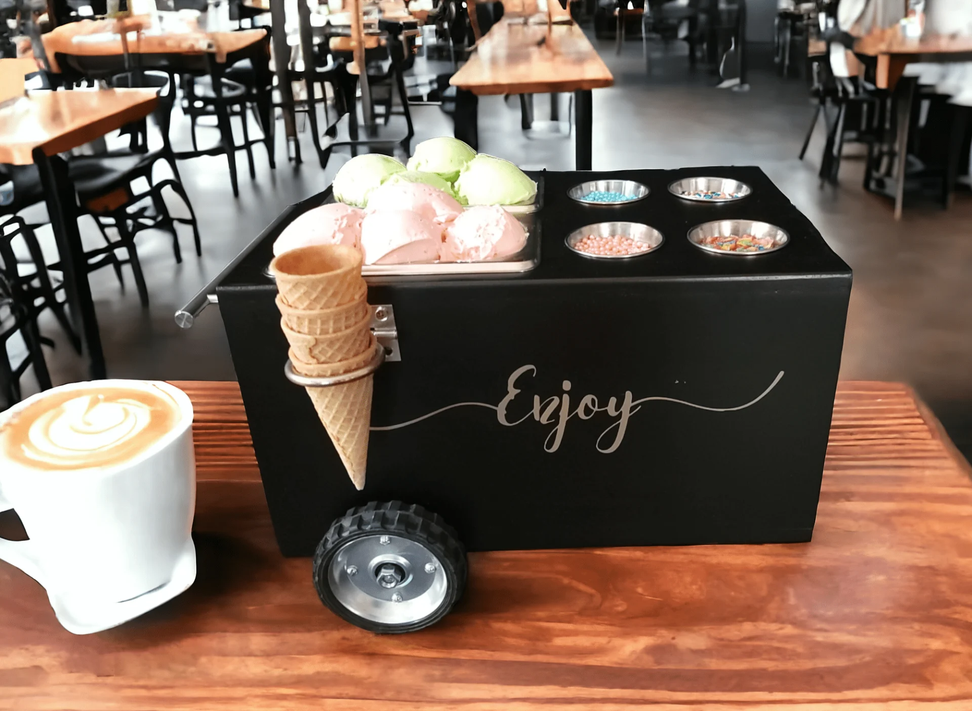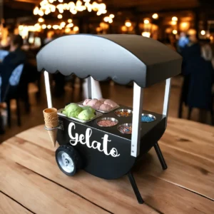 The Snack/Ice Cream Table Top Cart is versatile and great for various business settings, including ice cream shops, restaurants, and event halls. It also works perfectly for home events like birthday parties, bridal showers, and engagement parties. You can even personalize the cart with logos or decals to match your brand or event theme.