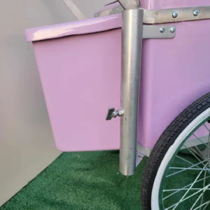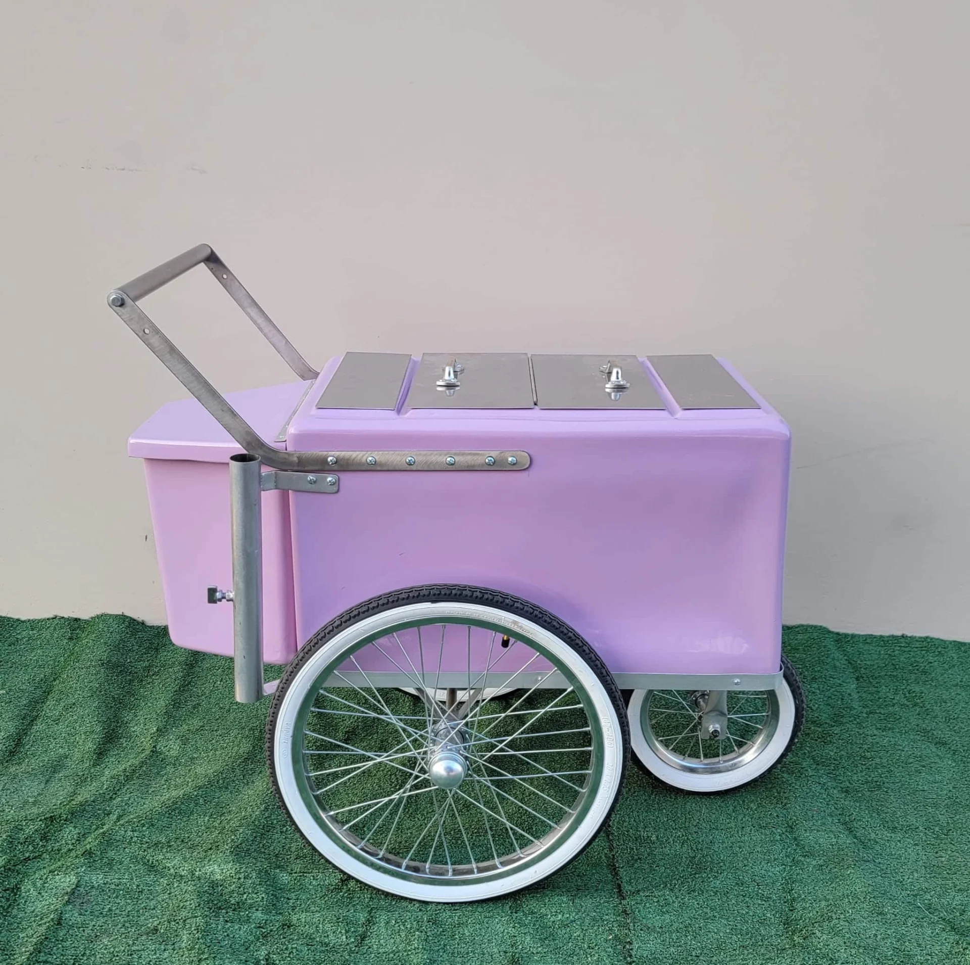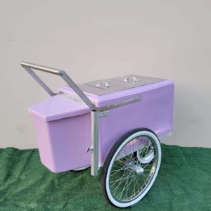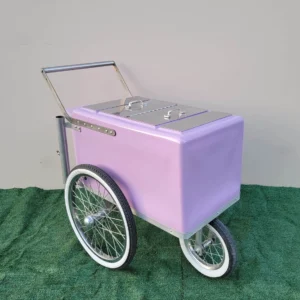 Looking to launch your own business or add an eye-catching element to your event? The Popsicle Cart Small Size Purple with stainless steel trim and bicycle Tires is the perfect solution. This timeless Paleta Cart, push cart for sale, push cart, featuring thick tires and a sturdy fiberglass build, makes it easy to serve frozen treats and more, anywhere you go. Its sleek design and portability make it a must-have for catering businesses, events, or personal use.