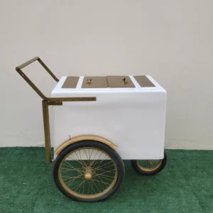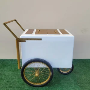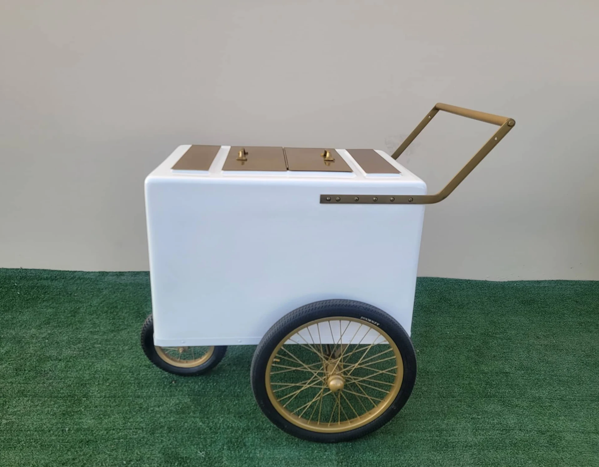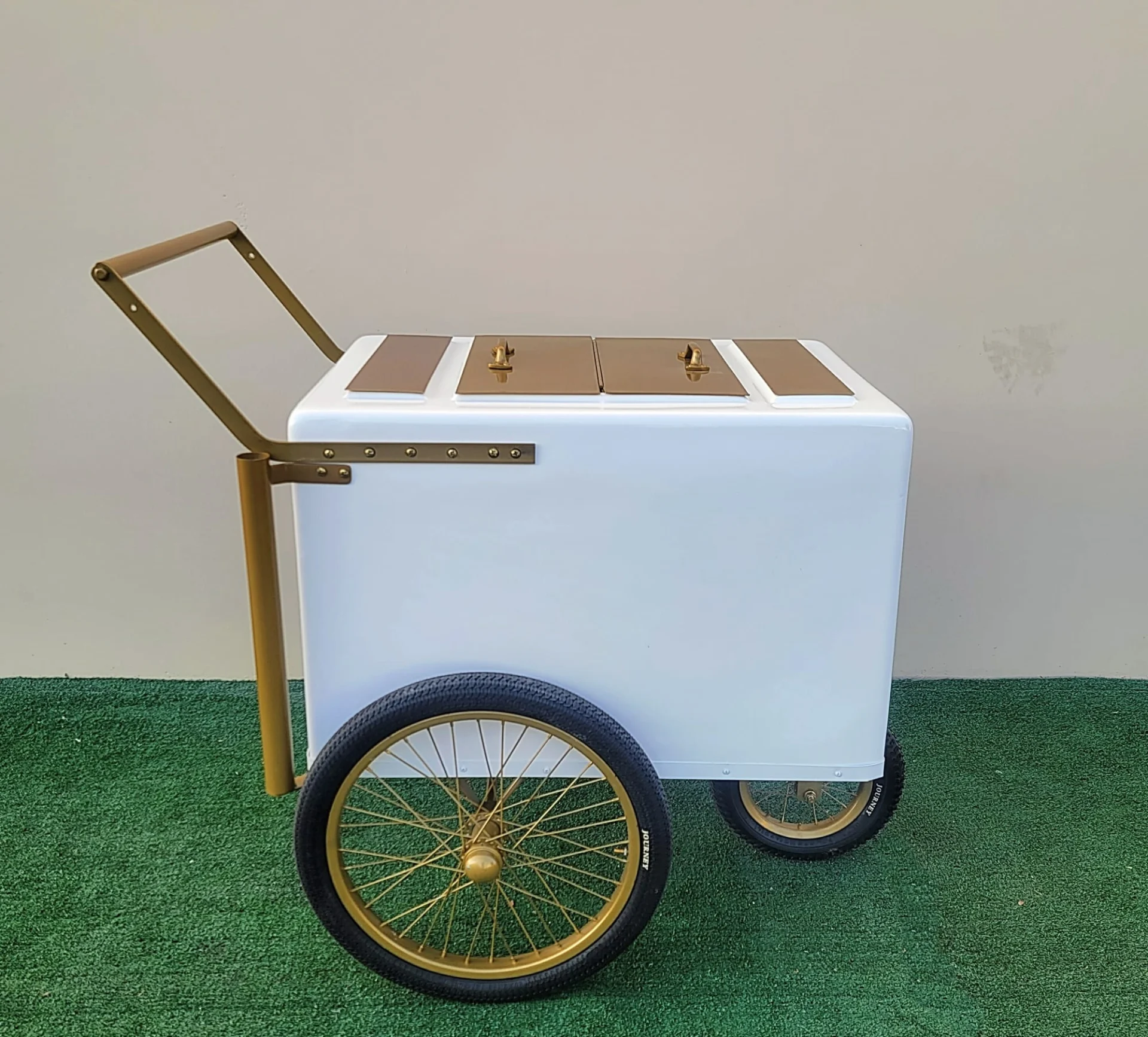 The Popsicle Cart with Gold Trim Standard Size with bicycle tires and white body trimmed in gold offers a sleek and functional solution for mobile frozen treats. Its beautiful gold-painted trim over stainless steel gives it a sophisticated look, making it perfect for both personal and business use.