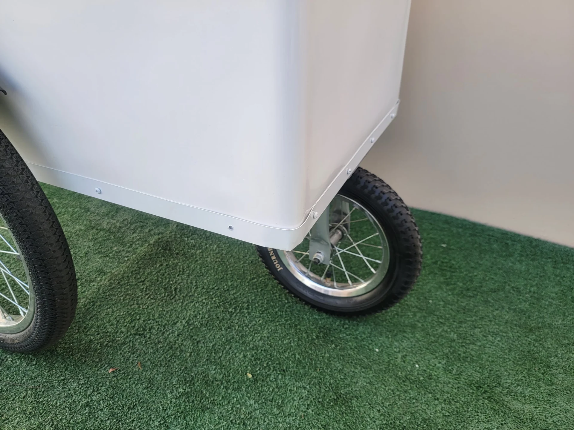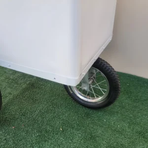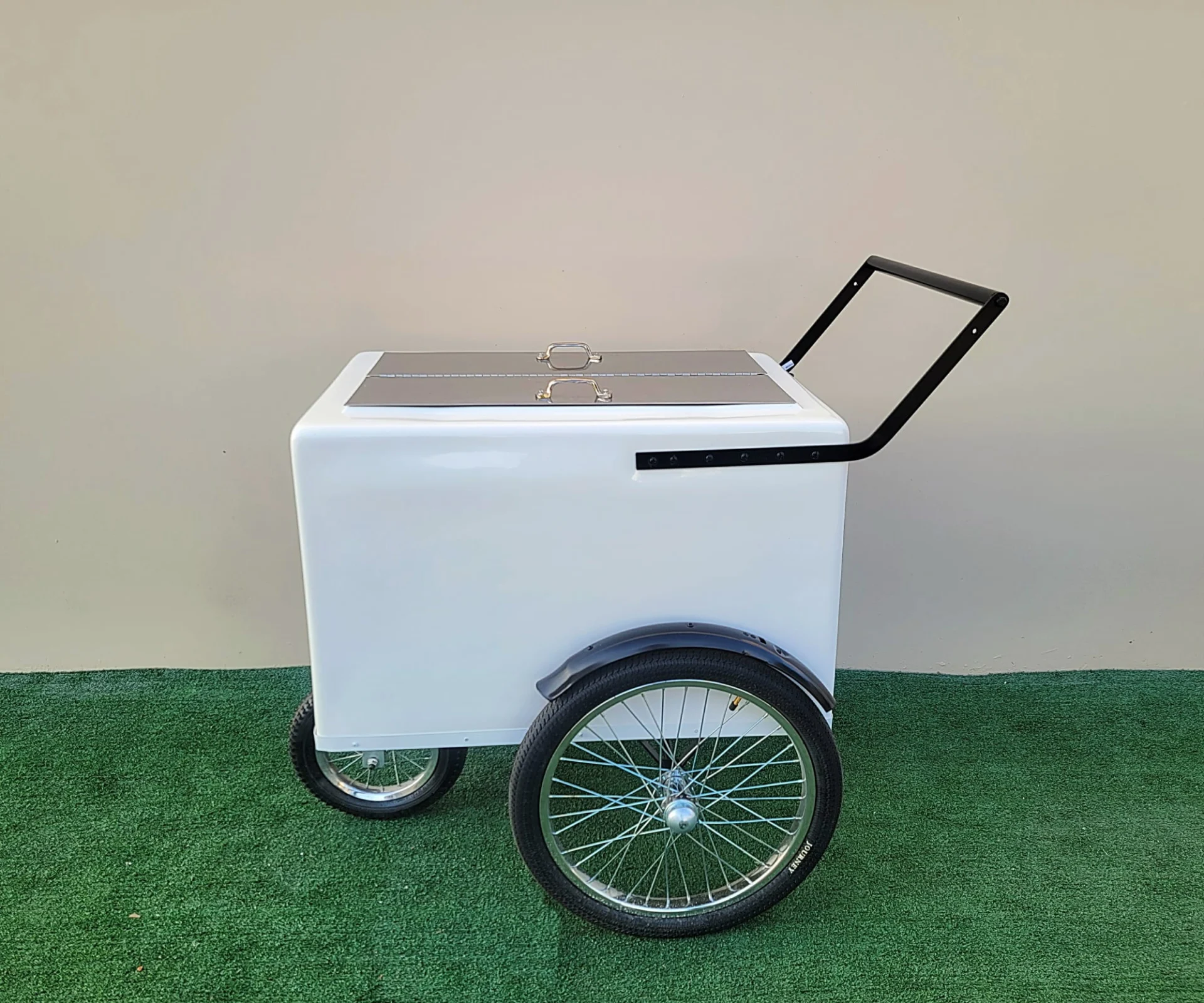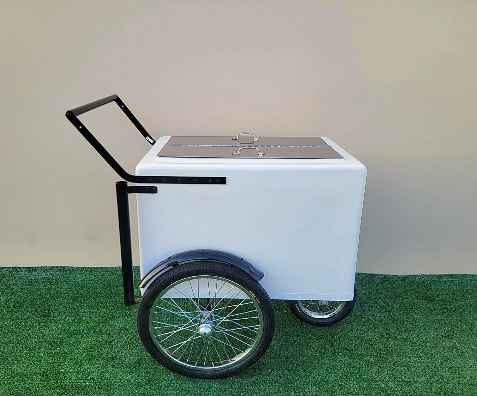 Introducing the Popsicle Cart with XL Door Standard Size featuring sleek black trim and durable bicycle tires. This stylish cart is designed for maximum storage, mobility, and functionality, perfect for entrepreneurs or event planners looking to add a unique touch to their business or gatherings.