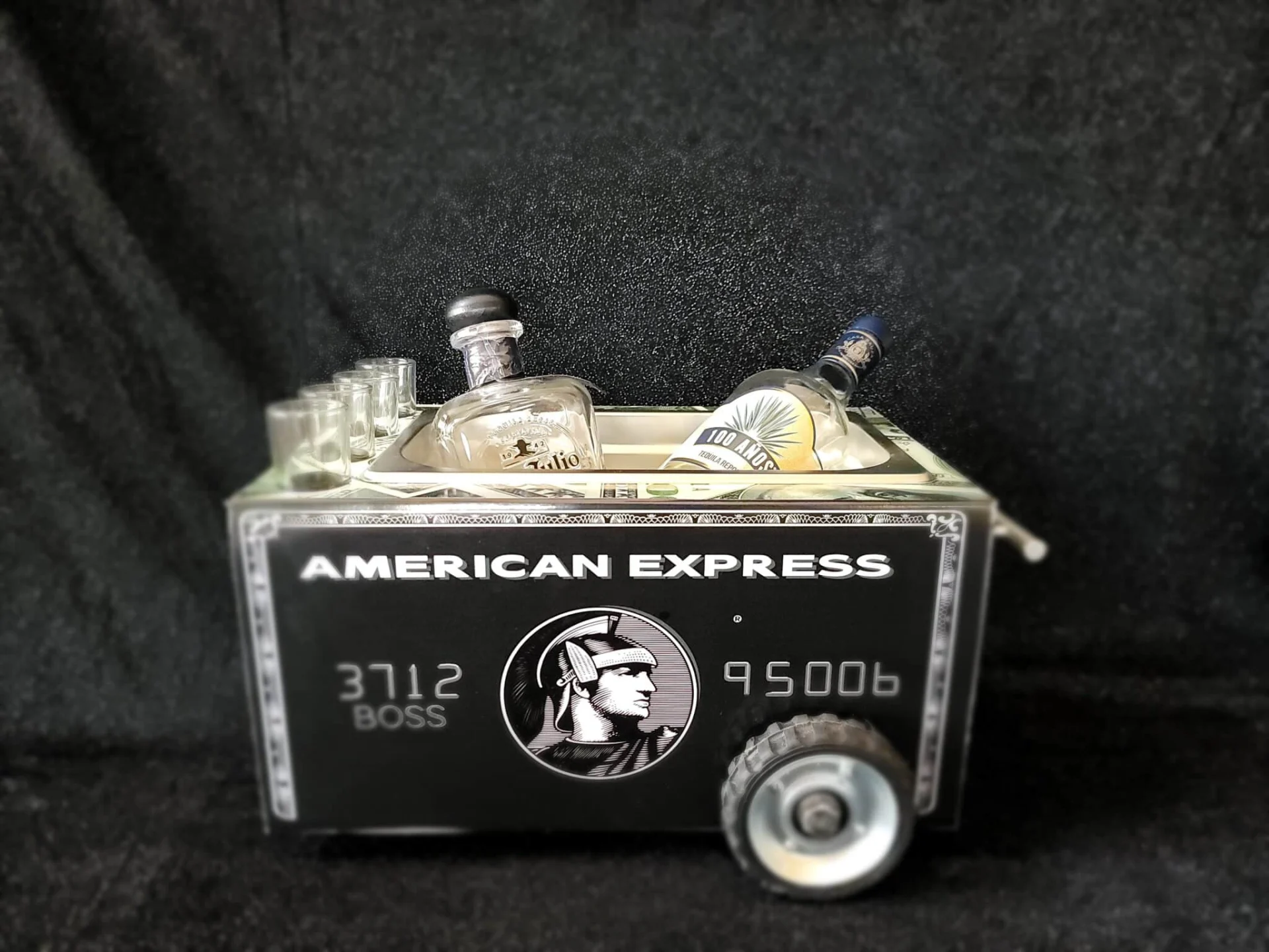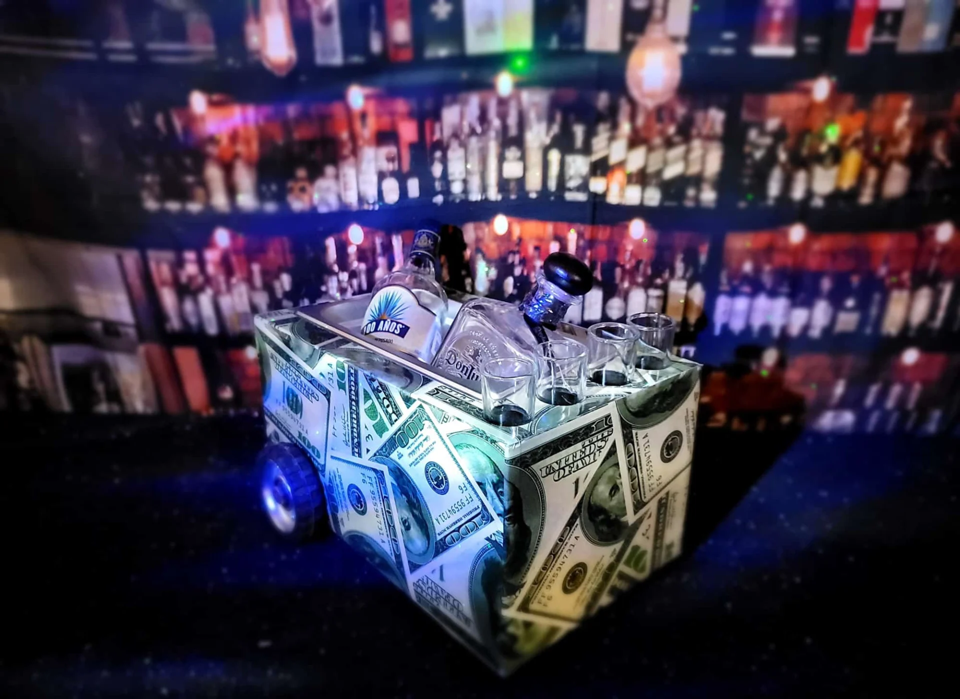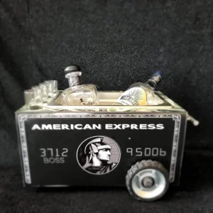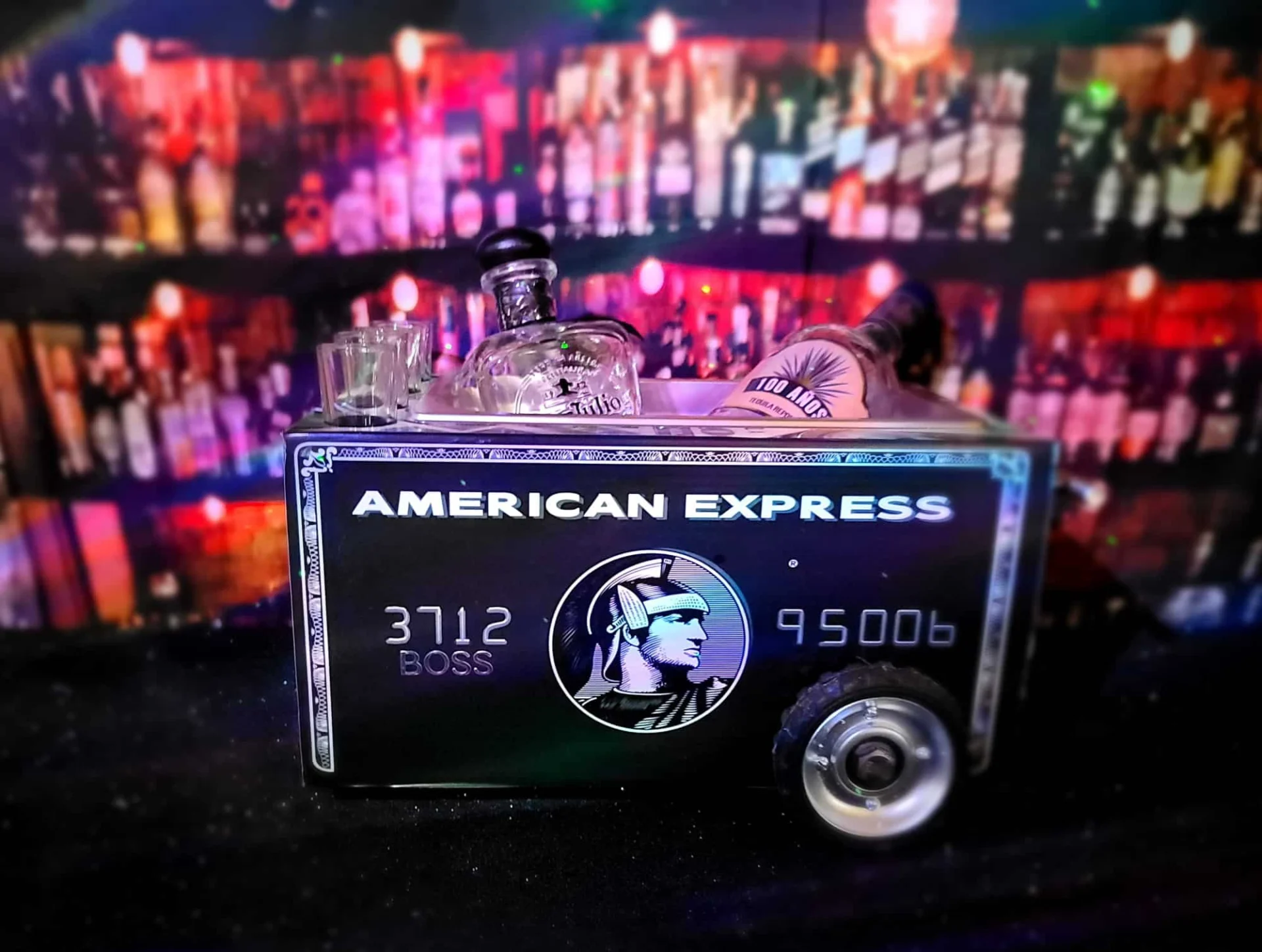 The Tabletop Shot Glass Bar Cart wrapped in dollar bills and American Express logos is the perfect solution for those who love to celebrate success. Whether you’re using it for bottle service or as a fun addition to your bar, this tabletop cart screams BOSS and is sure to make an impression.