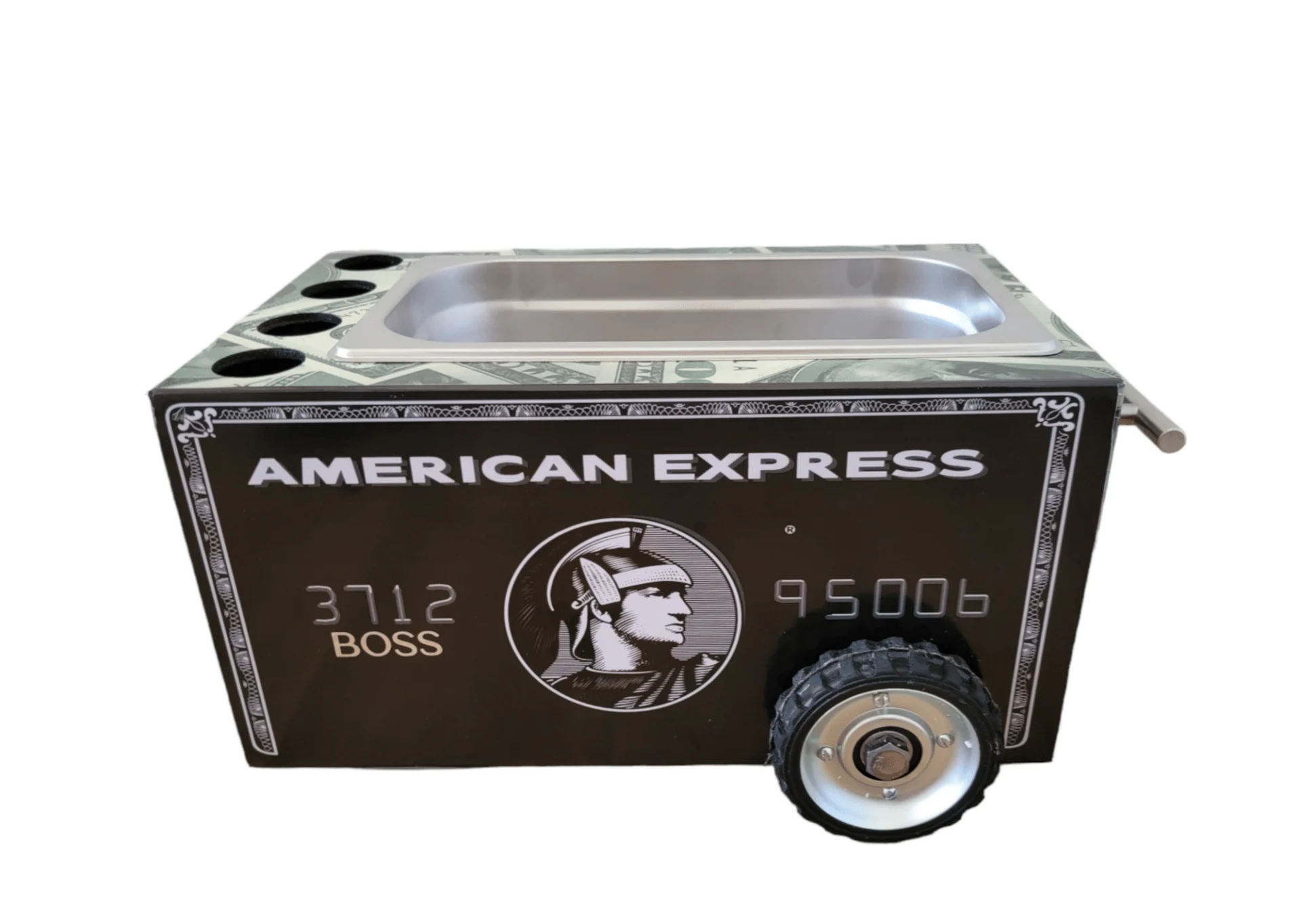 The Tabletop Shot Glass Cart is not only a functional serving tool but also a statement piece that enhances any business or personal event. Its unique design wrapped in dollar bills and AMEX logos creates an unforgettable experience for your guests, making it a perfect choice for business, home bars, and gifting.