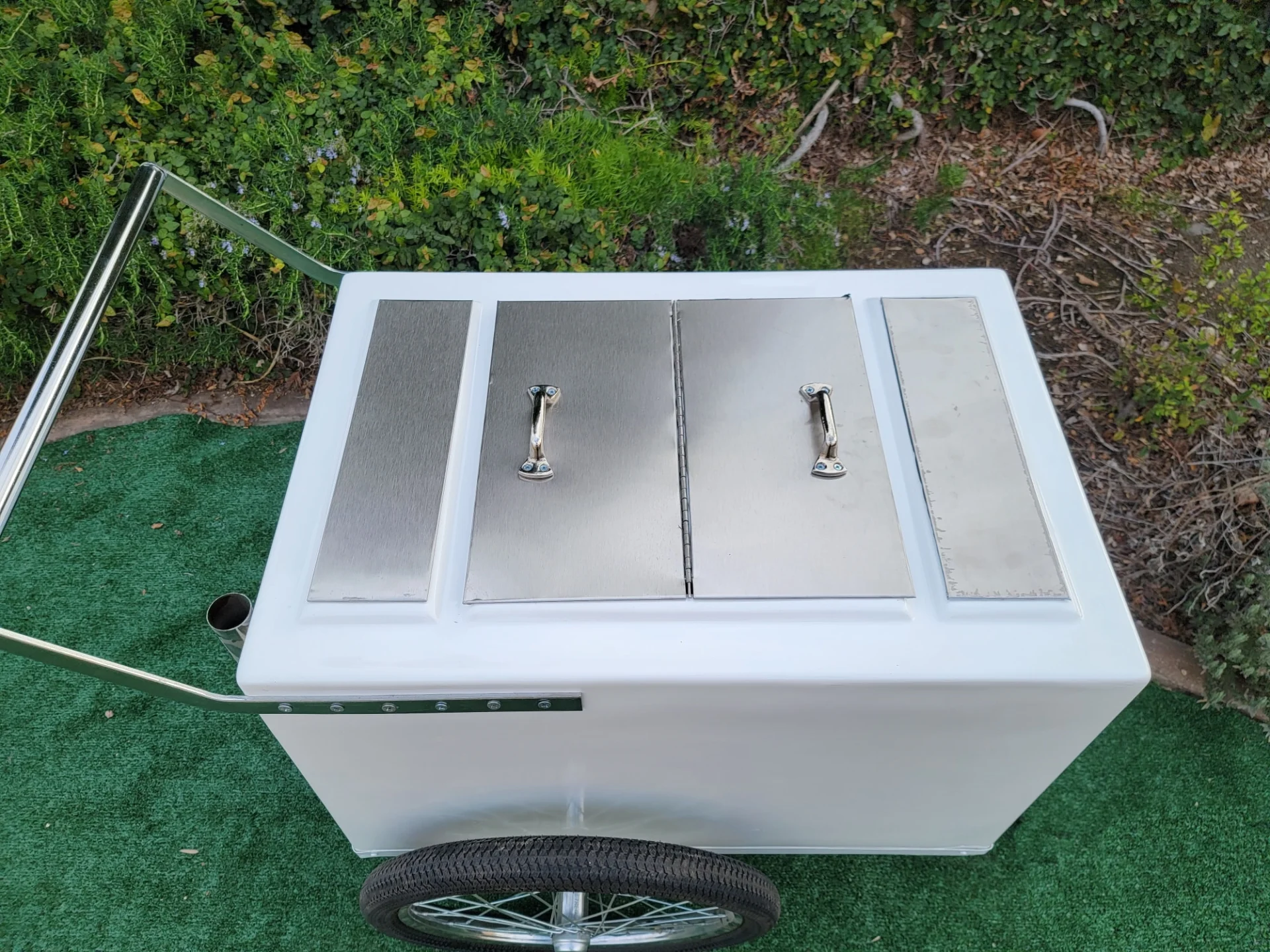 The cart features two top side openings designed for steel cold plates (sold separately), making it an efficient and cost-effective solution for maintaining your product’s temperature. Its lightweight design, coupled with 20” bicycle tires, makes it easy to maneuver across any event space, while the chrome trim adds a professional touch to your business presentation.