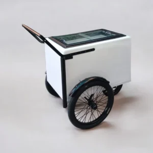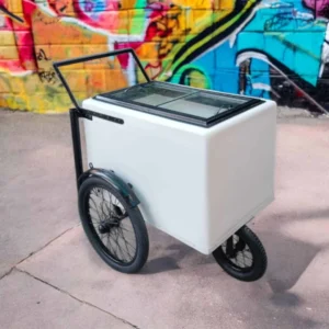 Designed to hold up to 400 popsicles or 3 three-gallon tubs, this popsicle cart is a great choice for high-volume events. It doesn’t require electricity and is easy to maneuver, thanks to the front wheel and 20-inch bicycle tires. The cart is built from fiberglass and features tempered glass sliding doors, ensuring durability and functionality.